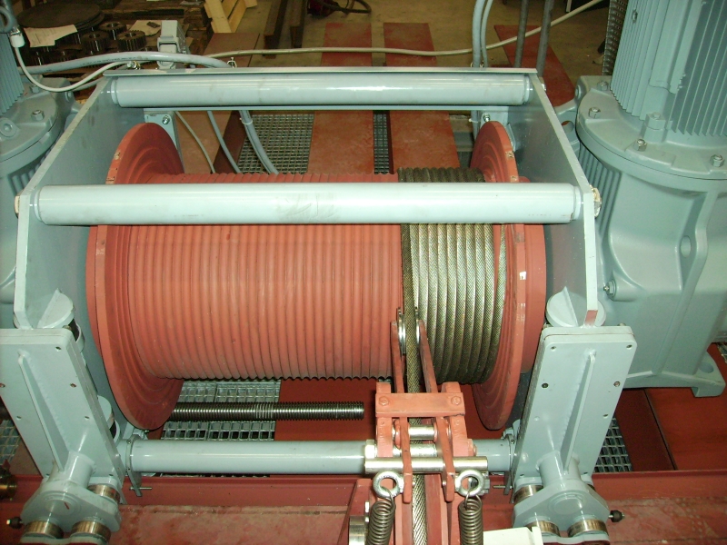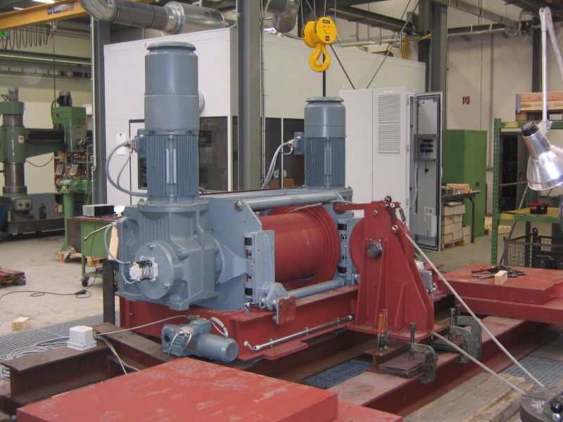 Die Hebezeugwinde kann 320m Stahlseil mehrlagig aufwickeln. Die von uns erstellte Software für den IMC-Controller berechnet je gewickelter Lage die Vorschubgeschwindigkeit der Aufspulvorrichtung, damit der stationäre Seillaufpunkt exakt bedient werden kann. Alle Antriebsumrichter sind für den Einzel- und Gruppenbetrieb über CANopen miteinander verbunden.